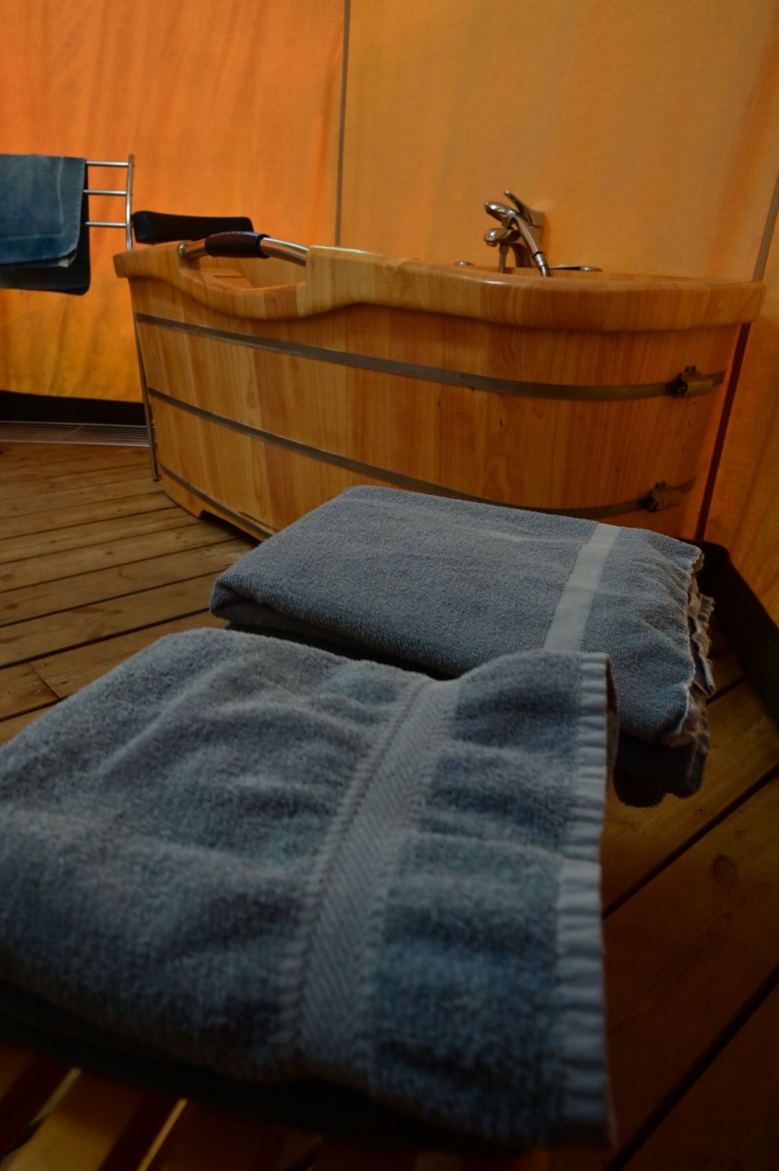 The bathroom with a freestanding bathtub and private toilet provide comfort and privacy for a relaxing nature stay in Southern Ardèche.