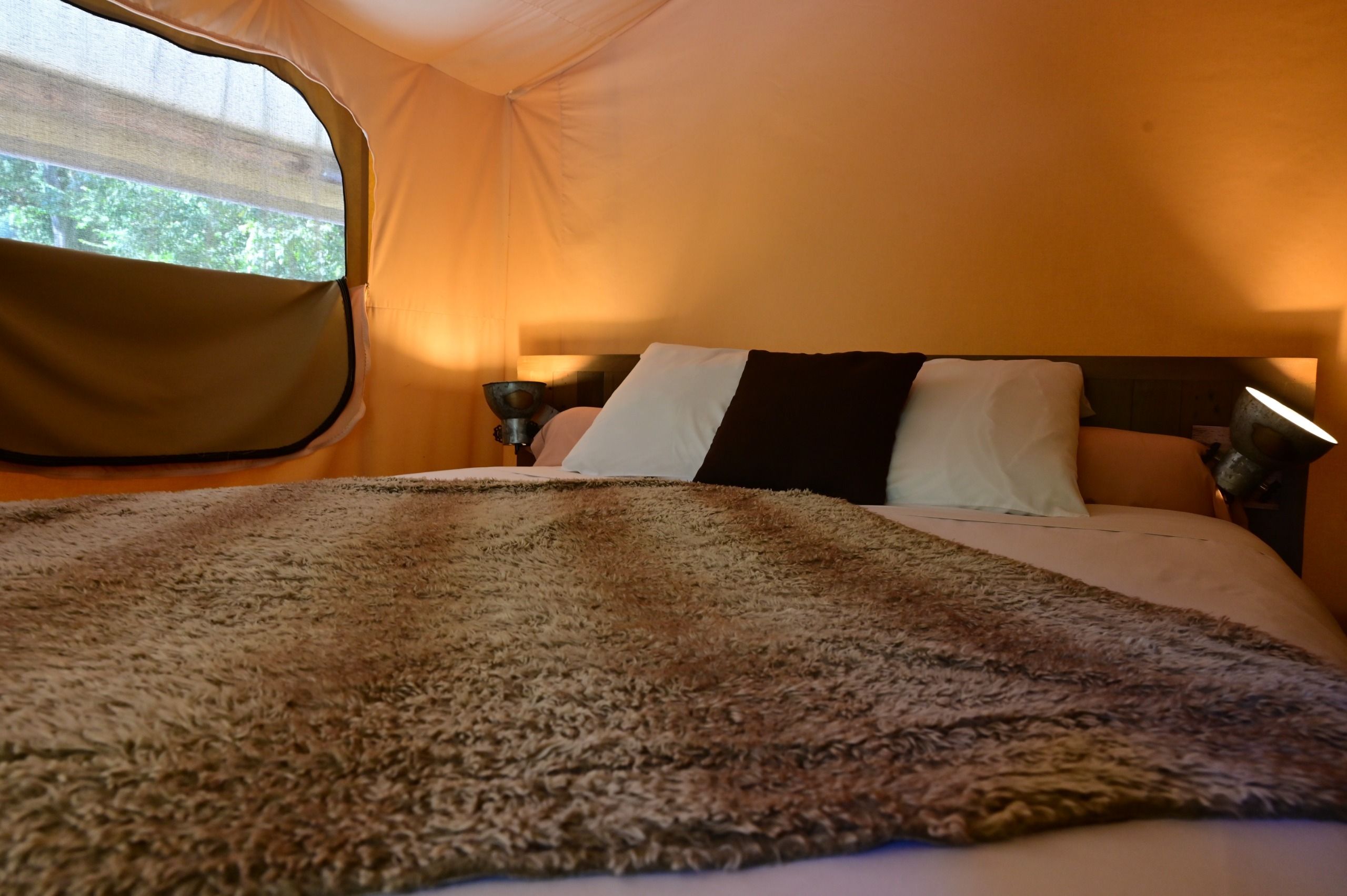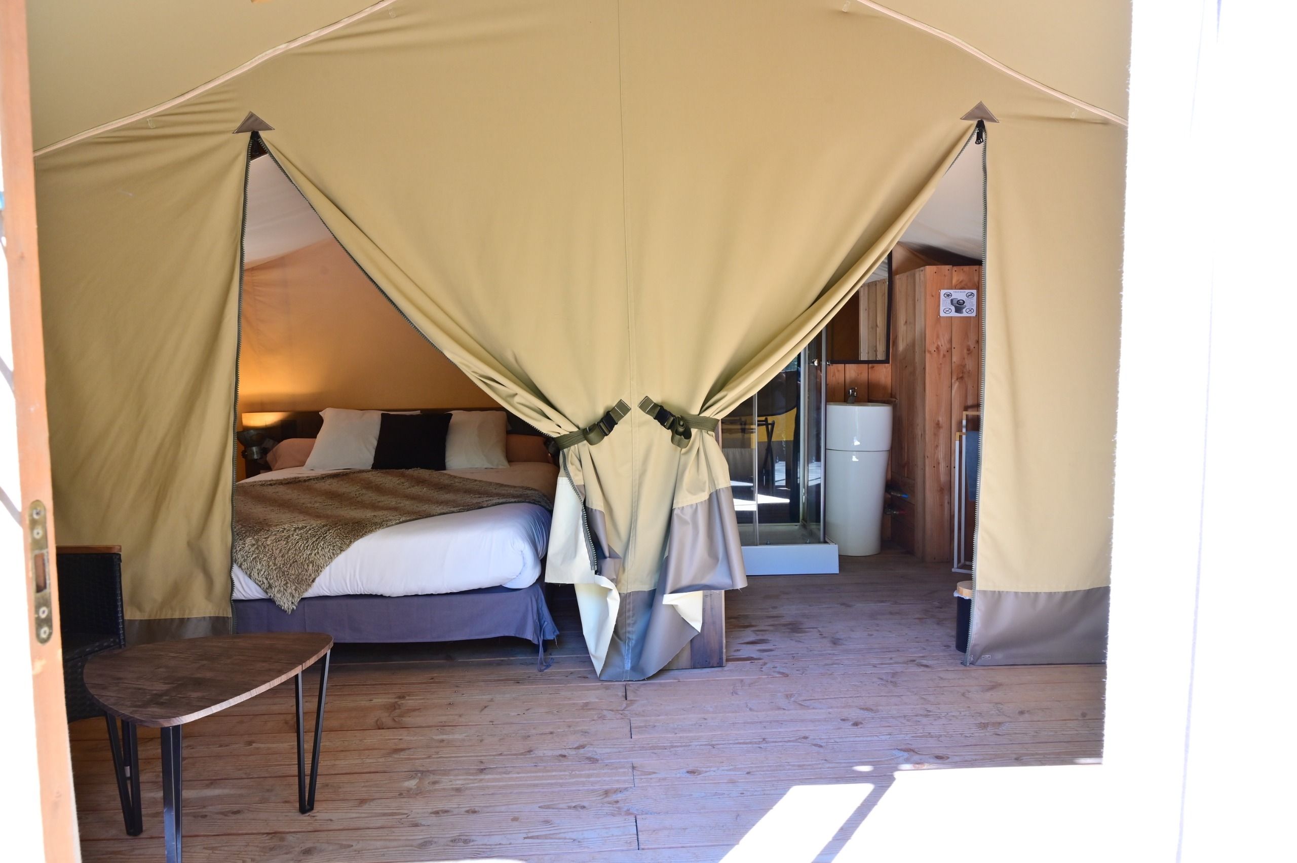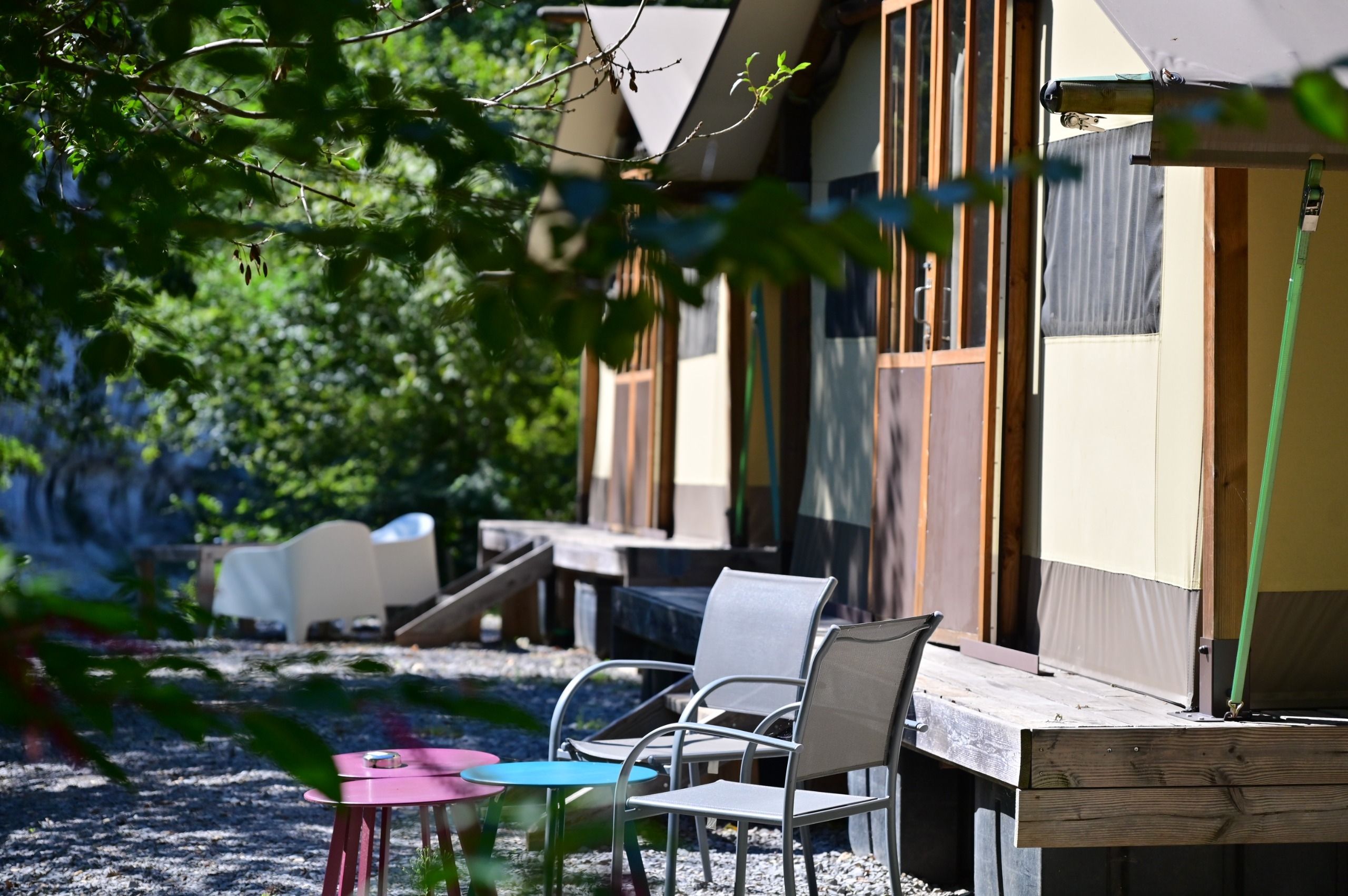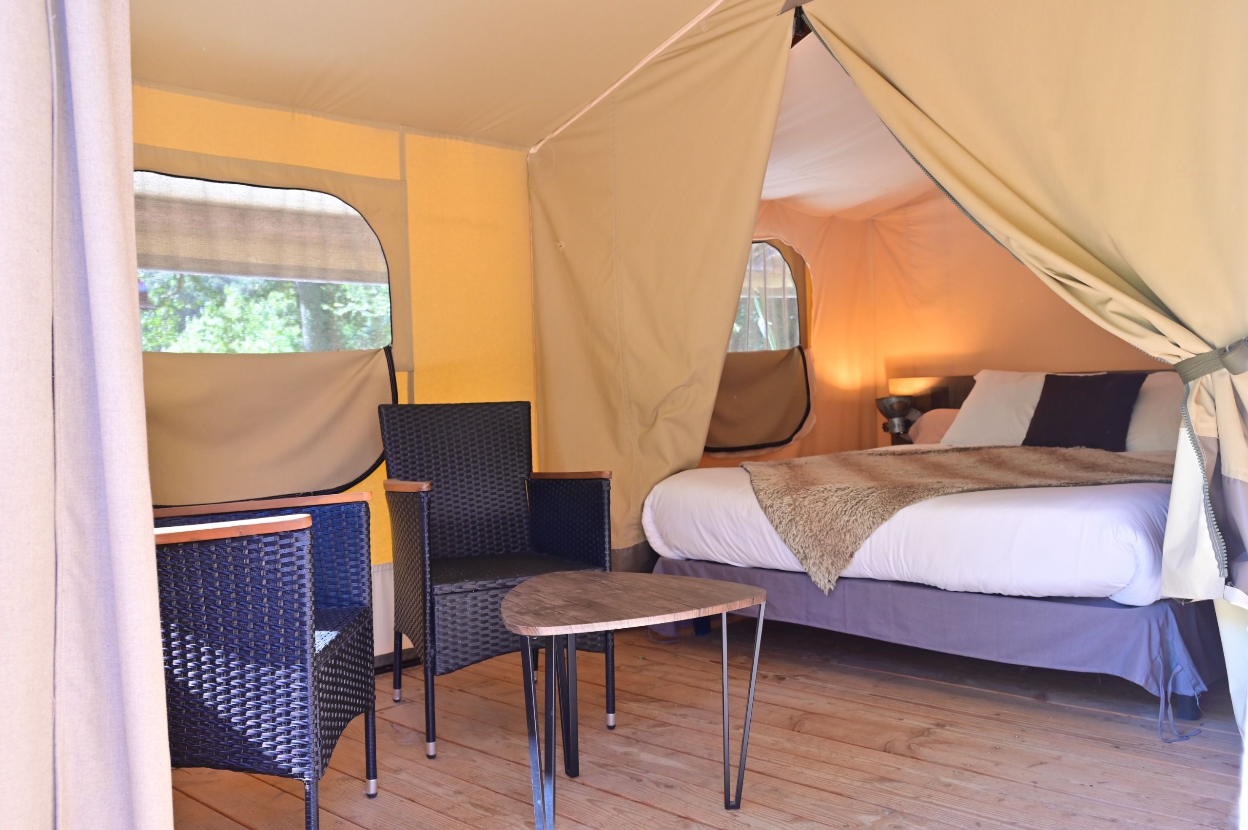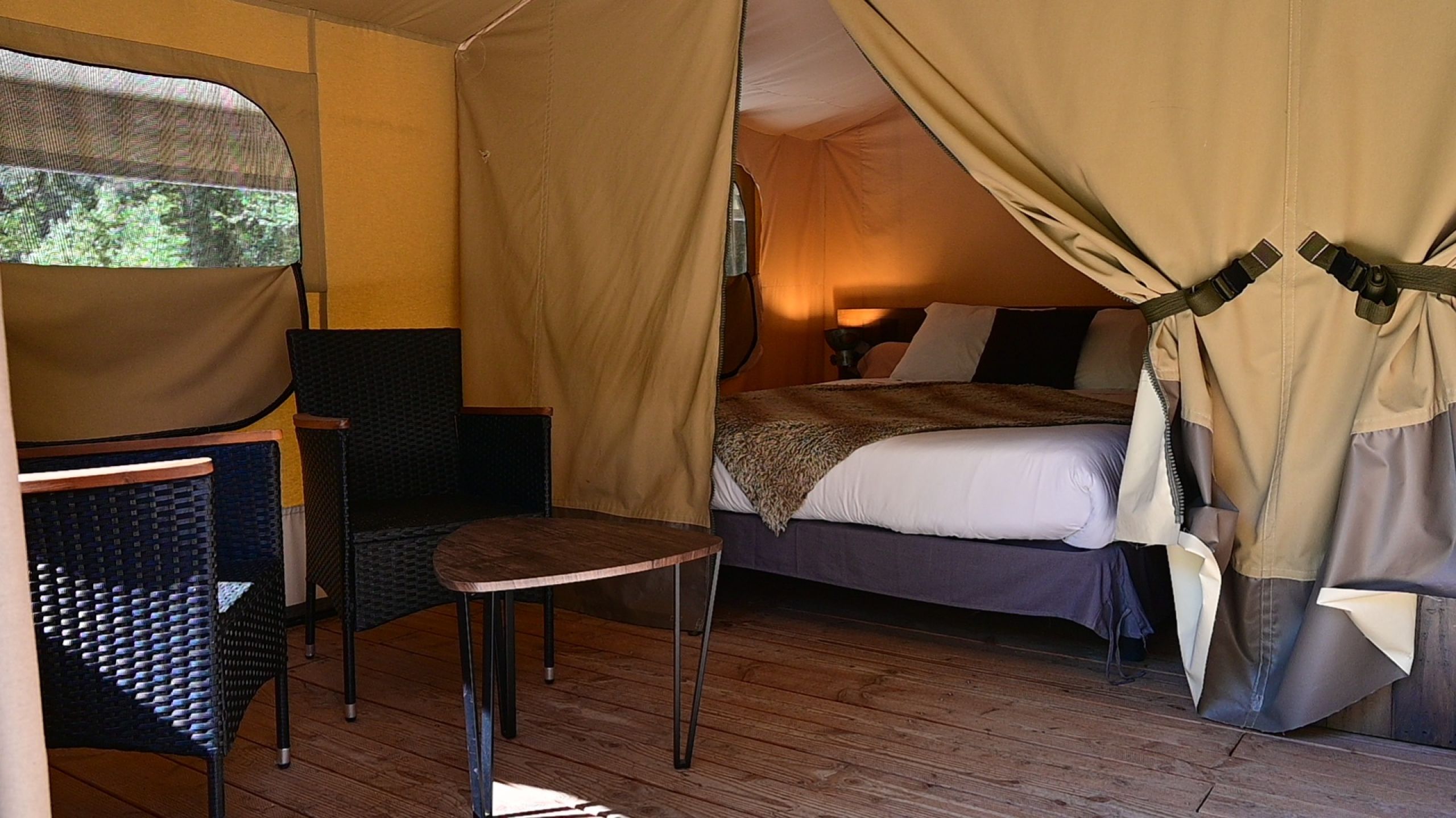 This 25 m² safari tent, overlooking the Branches rapid, offers a privileged view over the Ardèche River and the wild landscapes of the Ardèche Gorges.
