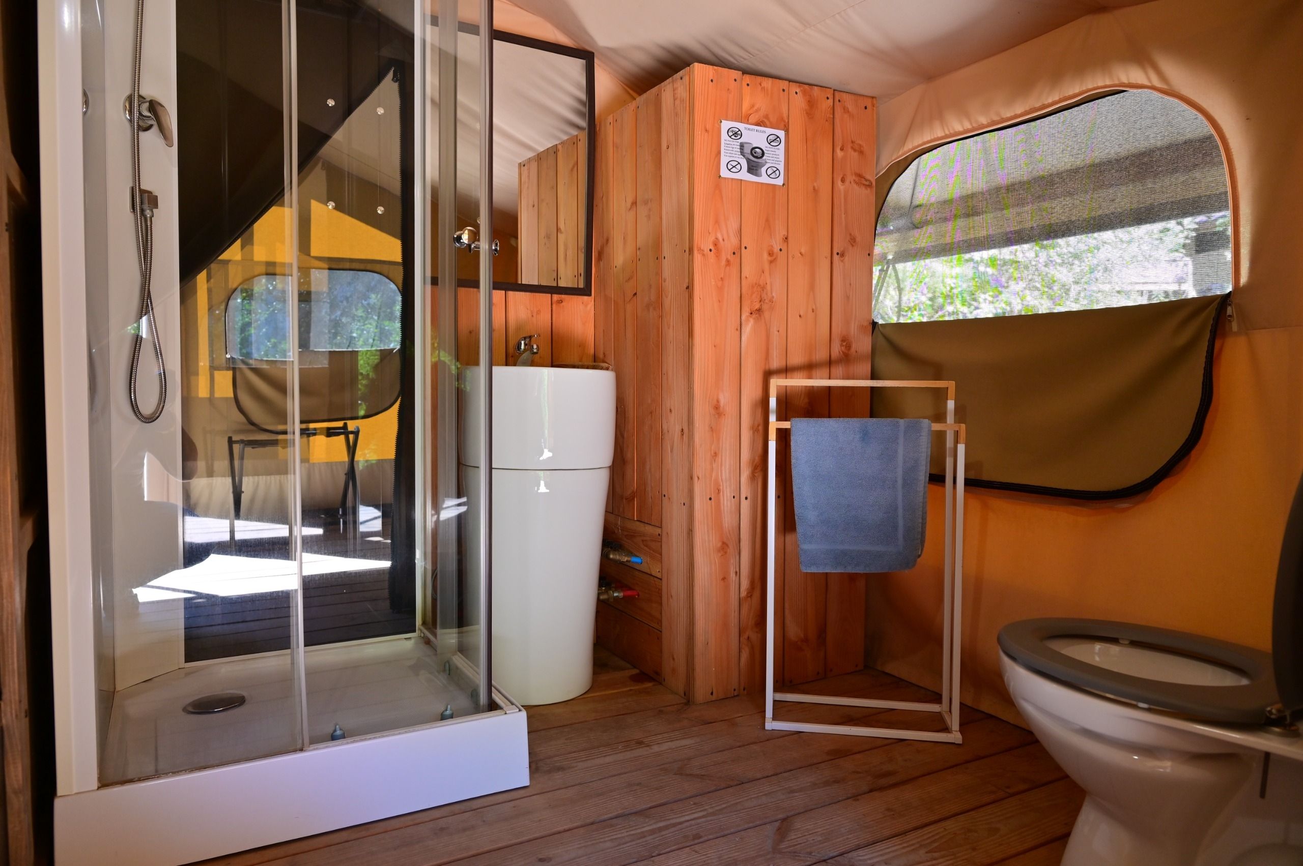 The accommodation features a 160 cm double bed, a separate toilet with shower, and a small indoor-outdoor lounge area to fully enjoy the surrounding nature.